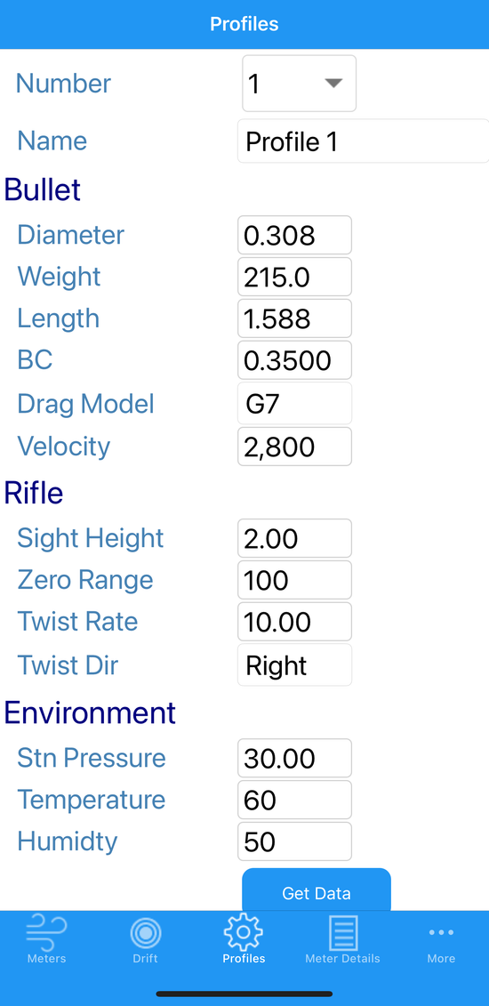 The Profile section lets you define your bullet characteristics, ballistic parameters and environmental conditions, — all of which help the app accurately